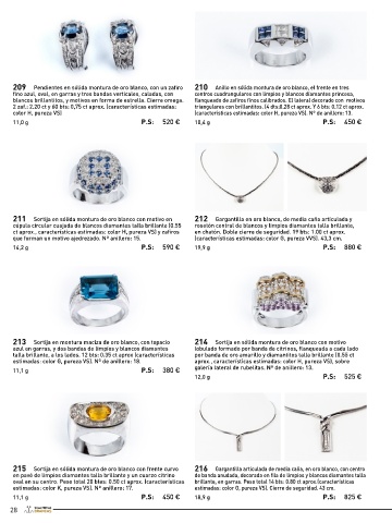 209 Pendientes en sólida montura de oro blanco, con un zafiro 210 Anillo en sólida montura de oro blanco, el frente en tres 217 Gargantilla con colgante en chatón de oro blanco con 218 Anillo media alianza en oro blanco, con frente en fila de