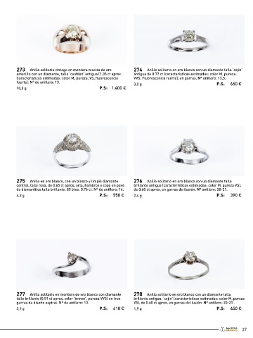 273 Anillo solitario vintage en montura maciza de oro 274 Anillo solitario en oro blanco con un diamante talla ‘cojín’