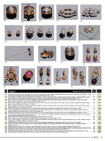286 Anillo quintillo vintage, en sólida montura de oro amarillo con frente en fila de diamantes talla brillante, sobre vistas de oro blanco. Peso 5 btes: 0.08 ct 5,7 230 € 302 Alfiler vintage en montura de oro rosa, con perla cultivada central (7,2 mm) y motivo de lazos y flores, calado, cuajado de circonitas (falta una), sobre 7,0 260 €