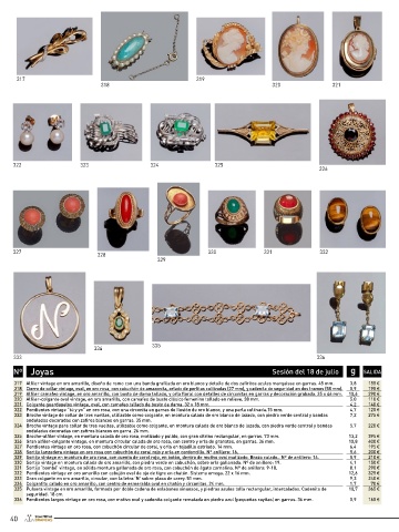319 Alfiler camafeo vintage, en oro amarillo, con busto de dama tallado, y orla floral con detalles de circonitas en garras y decoración grabada. 35 x 46 mm. 10,6 290 € 339 Anillo septillo en oro amarillo con fila de circonitas en garras. Nº anillero: 12. 3,3 130 €