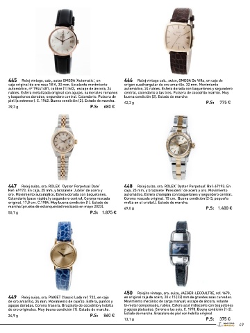 441 Reloj vintage, cab., suizo OMEGA, en sólida caja de oro 442 Reloj vintage, cab., suizo LONGINES. Caja de origen en oro 447 Reloj suizo, sra. ROLEX ‘Oyster Perpetual Date’ 448 Reloj suizo, sra. ROLEX ‘Oyster Perpetual’ Ref: 67193. En