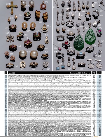 290 Alfiler antiguo ‘decó’ en montura calada de oro rosa con vistas de plata, con motivo geométrico calado, con un diamante talla brillante antigua central, otros dos centros de brillantes, bandas de zafiritos 4,4 240 € 339 Sortija en oro amarillo, formada por tres anillos articulados en la base con frente en bandas de esmeraldas, zafiros y rubíes finos calibrados, y dos diamantitos talla brillante, formando 6,8 295 €