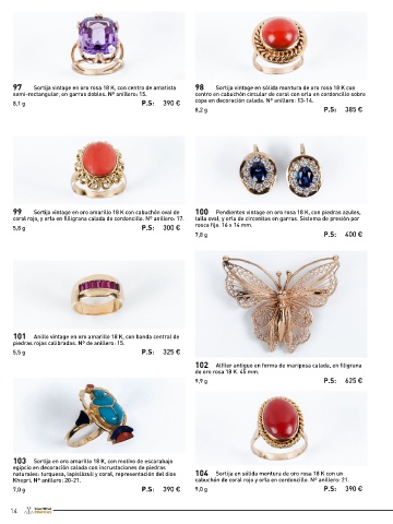 99 Sortija vintage en oro amarillo 18 K con cabuchón oval de 100 Pendientes vintage en oro rosa 18 K, con piedras azules, 107 Anillo en oro amarillo 18 K, con piedra oval color citrino- 108 Sortija lanzadera vintage en oro amarillo con un gran