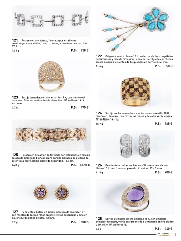 117 Sortija lanzadera en sólida montura de oro amarillo 18 K, 118 Sortija en sólida montura de oro blanco 18 K, diseño 125 Pulsera en oro amarillo formada por eslabones en celosía