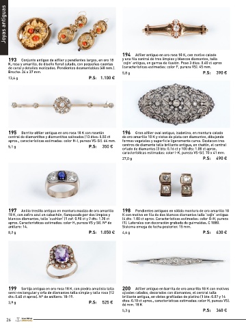 195 Barrita-alfiler antigua en oro rosa 18 K con rosetón 196 Gran alfiler oval antiguo, isabelino, en montura calada 203 Pendientes ‘art-decó’ en platino y oro amarillo, con un