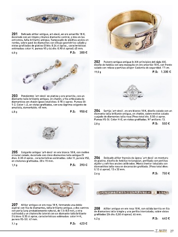 195 Barrita-alfiler antigua en oro rosa 18 K con rosetón 196 Gran alfiler oval antiguo, isabelino, en montura calada 203 Pendientes ‘art-decó’ en platino y oro amarillo, con un
