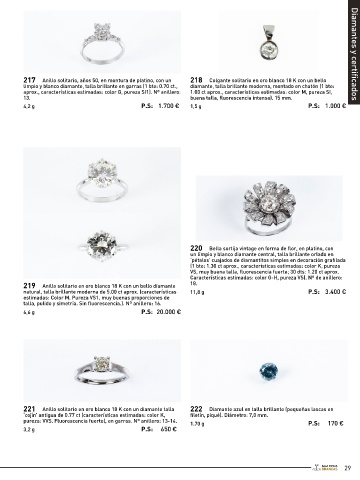 Características estimadas: color H, pureza VS) y dos piedras rojas, 210 Alfiler antiguo, en montura de oro amarillo 18 K y vistas 217 Anillo solitario, años 50, en montura de platino, con un 218 Colgante solitario en oro blanco 18 K con un bello