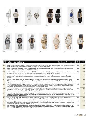540 Lote de dos relojes sra., vintage: uno de la firma francesa FLAMOR, en caja oval de plata 800 mil y brazalete de plata y caña natural (19,5 cm), 62,9 50 € 551 Reloj cab., vintage, suizo CYMA, en caja circular, 38 mm., plaqué-oro y brazalete elástico. Esfera original blanca con baquetones y agujas 59,4 70 €
