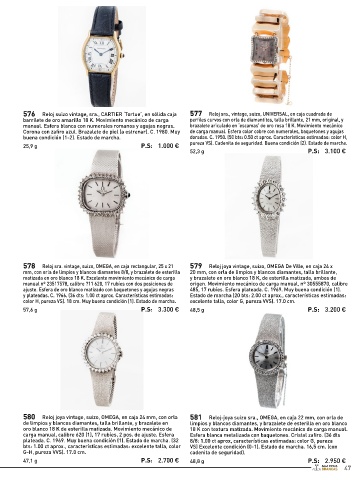570 Reloj vintage, cab. suizo, LONGINES Flaship, en caja de origen 571 Reloj vintage, cab. suizo, OMEGA, en caja de oro amarillo 576 Reloj suizo vintage, sra., CARTIER ‘Tortue’, en sólida caja 577 Reloj sra., vintage, suizo, UNIVERSAL, en caja cuadrada de