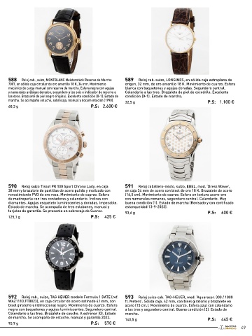 de blancos brillantes en garras, y brazalete de esterilla matizada en 4468) en caja circular de oro amarillo 18 K, 32 mm. Movimiento 588 Reloj cab., suizo, MONTBLANC Meisterstück Reserve de Marche 589 Reloj cab. suizo, LONGINES, en sólida caja extraplana de