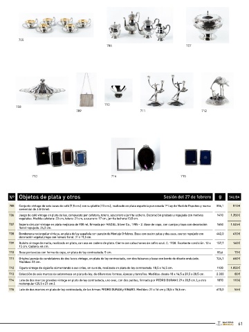 697 Pareja de cajitas vintage en plata de ley mejicana, con incrustaciones de piedras naturales en la tapa. Una en forma de libro: 31 x 27 mm., y otra 47,3 80 € 709 Bolsito vintage de malla, realizado en plata, con asa en cadena de plata. Cierre con cabuchones de zafiro azul. C. 1930. Excelente condición. 13 x 157,7 160 €
