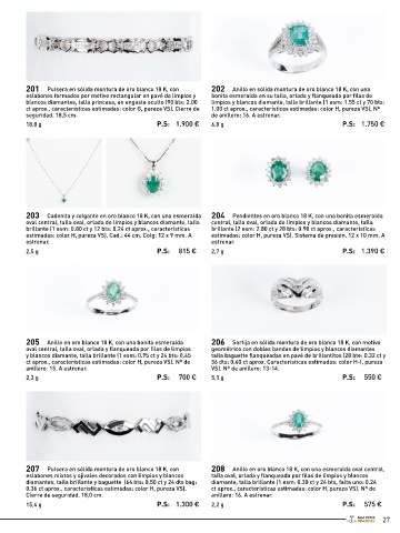 199 Pendientes largos en oro blanco 18 K, con banda 207 Pulsera en sólida montura de oro blanco 18 K, con 208 Anillo en oro blanco 18 K, con una esmeralda oval central,