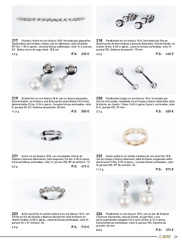 209 Anillo en sólida montura de oro blanco 18 K, con un bonito 210 Pendientes rosetón en sólida montura de oro blanco 18 K, 217 Pulsera riviere en oro blanco 18 K, formada por pequeños 218 Pendientes en oro blanco 18 K, formados por fila en