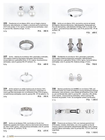 229 Anillo solitario en sólida montura de oro blanco 18 K, 230 Bonitos pendientes de SUAREZ en oro blanco 18 K, con