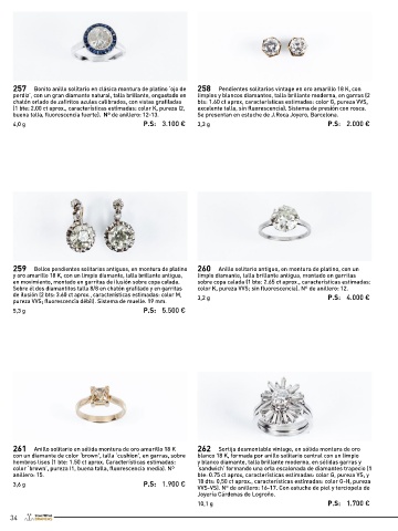 257 Bonito anillo solitario en clásica montura de platino ‘ojo de 258 Pendientes solitarios vintage en oro amarillo 18 K, con 269 292