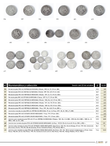 592 Lote de tres monedas de plata, México: 1) Cien Pesos, 1978, 39 mm. 2) Cinco Pesos, 1951. 40 mm (ambas de 720 mil, con contenido de 20 g de 55,7 70 € 610 Lote de cuatro monedas de plata (900 mil). ESTADOS UNIDOS MEXICANOS: Dos Pesos, 1921. Mo. 100 Aniversario Independencia, 39 mm. Cinco 114,4 125 €