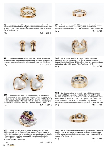 ct aprox., características estimadas: color H, pureza VS). Nº de anillero: 13. pureza VS). Nº de anillero: 14.