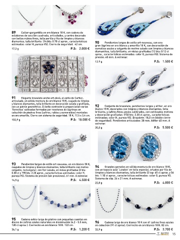 vegetal. Nº anillero: 13. azul. Sistema americano. 14,2 x 11,2 mm. 95 Cadena extra-larga de platino con pequeñas cuentas en 96 Cadena larga de oro blanco 18 K con 61 zafiros finos azules
