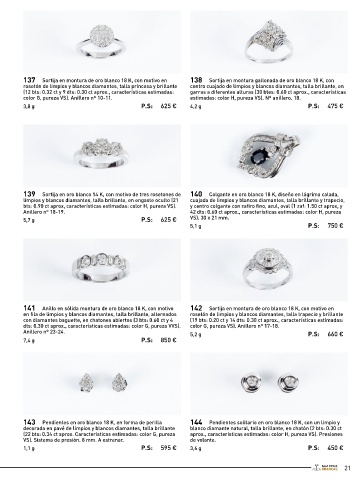 135 Anillo media alianza en oro blanco 18 K, con banda central 136 Anillo en oro blanco 18 K, motivo cuadrangular con un 143 Pendientes en oro blanco 18 K, en forma de perilla 144 Pendientes solitario en oro blanco 18 K, con un limpio y