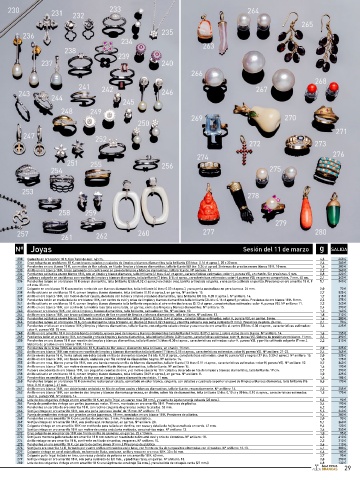 197 Sortija vintage en oro blanco 18 K con centro de perla cultivada (8 mm.), entre dos diamantes talla brillante (2 btes: 0.50 ct aprox., características estimadas: 3,4 400 € 237 Colgante en oro blanco 18 K con motivo romboide con blancos diamantitos, talla brillante (4 btes: 0.03 ct aprox.), y una perla australiana en pera barroca. 24 mm. 2,0 325 €