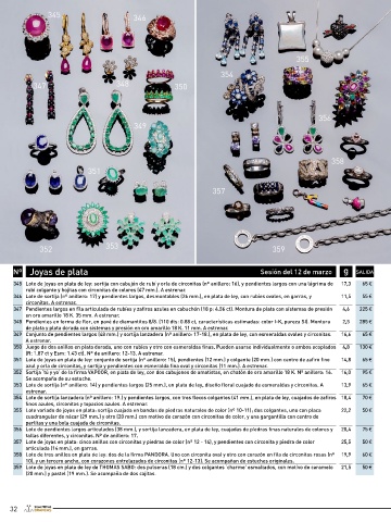 345 Lote de joyas en plata de ley: sortija con cabujón de rubí y orla de circonitas (nº anillero: 16), y pendientes largos con una lágrima de 17,3 65 € 360 Lote de tres pulseras en plata de ley: una dorada con rosetones de topacios azules y orla de circonitas (20 cm.), otra con flores 32,6 75 €