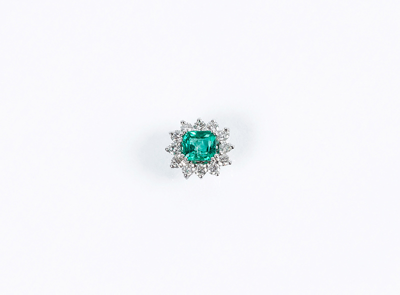 Colgante en oro blanco 18 K con una bellísima esmeralda colombiana, en su talla, orlada de limpios y blancos diamantes, talla brillante en garritas (1 Esm; 1.00 ct aprox, 12 bts: 0.50 ct aprox, características estimadas: color H, pureza VS). 12 x 10 mm.