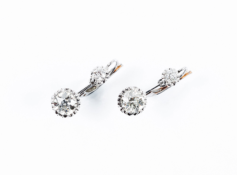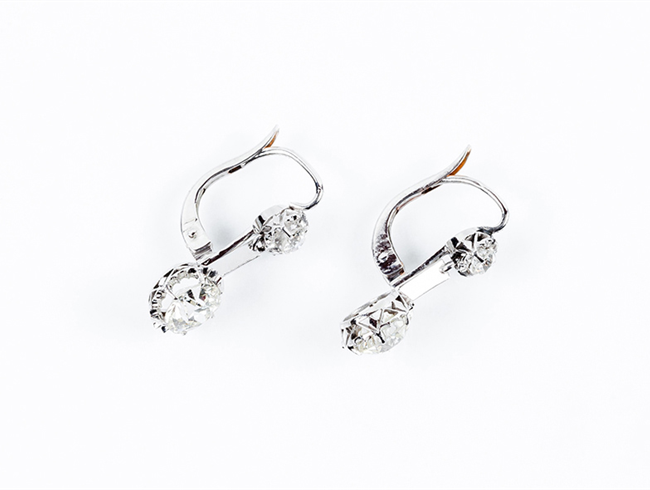 Bellos pendientes vintage en oro blanco 18 K con dos limpios diamantes naturales en movimiento, en garras de ilusión, en talla brillante antigua (2 bts: 2.20 ct aprox., características estimadas: color H-I, pureza VS-SI, fluorescencia débil; 2 dts: 0.20 ct), unidos por barrita articulada. 25 mm.