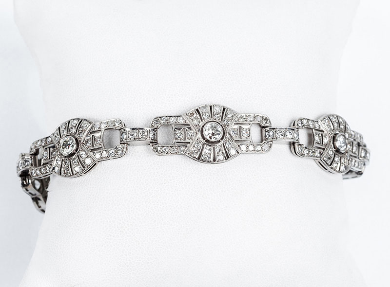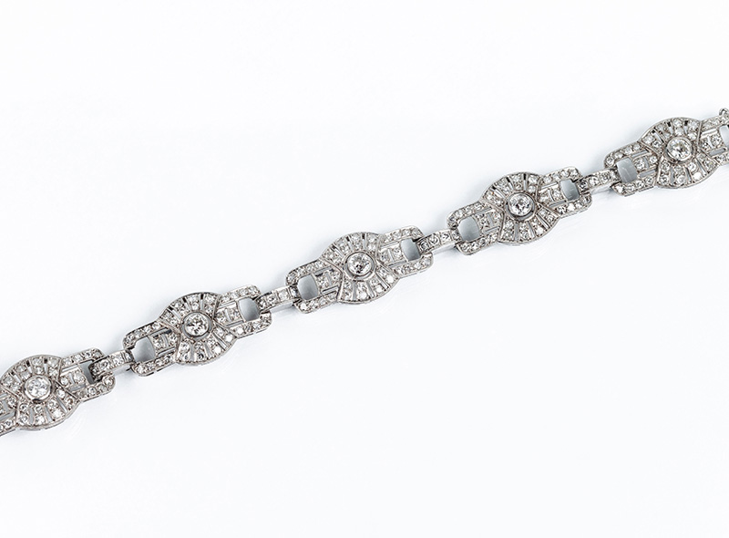 Bello brazalete antiguo, época 'art-decó', en platino, formado por eslabones ovales, con un limpio y blanco diamante central, talla brillante, en chatón, sobre motivo geométrico calado cuajado de diamantitos talla 8/8, en vistas grafiladas (5 bts: 1.20 ct aprox., características estimadas: color H, pureza VS y 180 dts: 4.00 ct aprox., características estimadas: color H, pureza VS). Ciere y cadenita de seguridad. 15,6 cm.