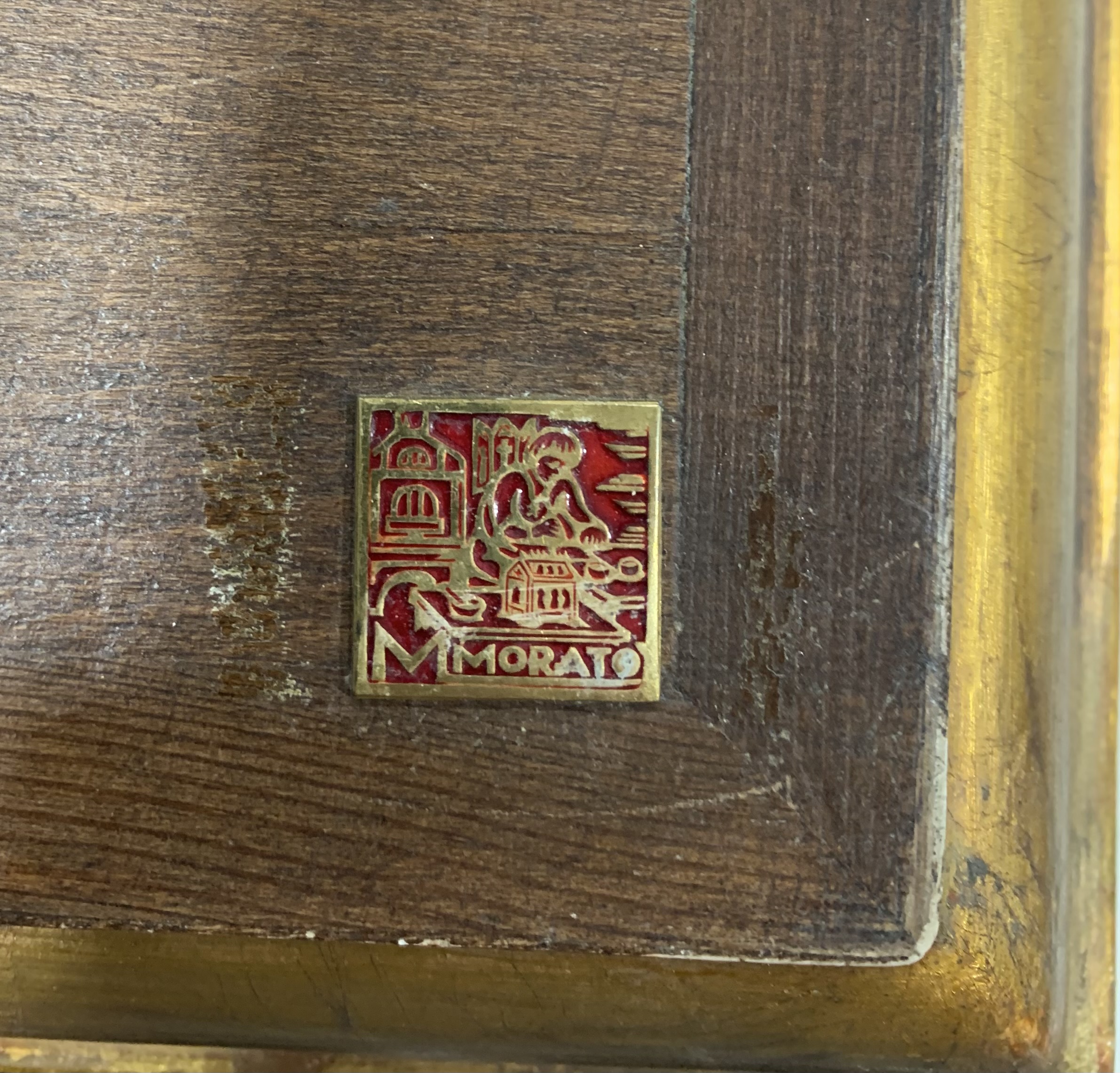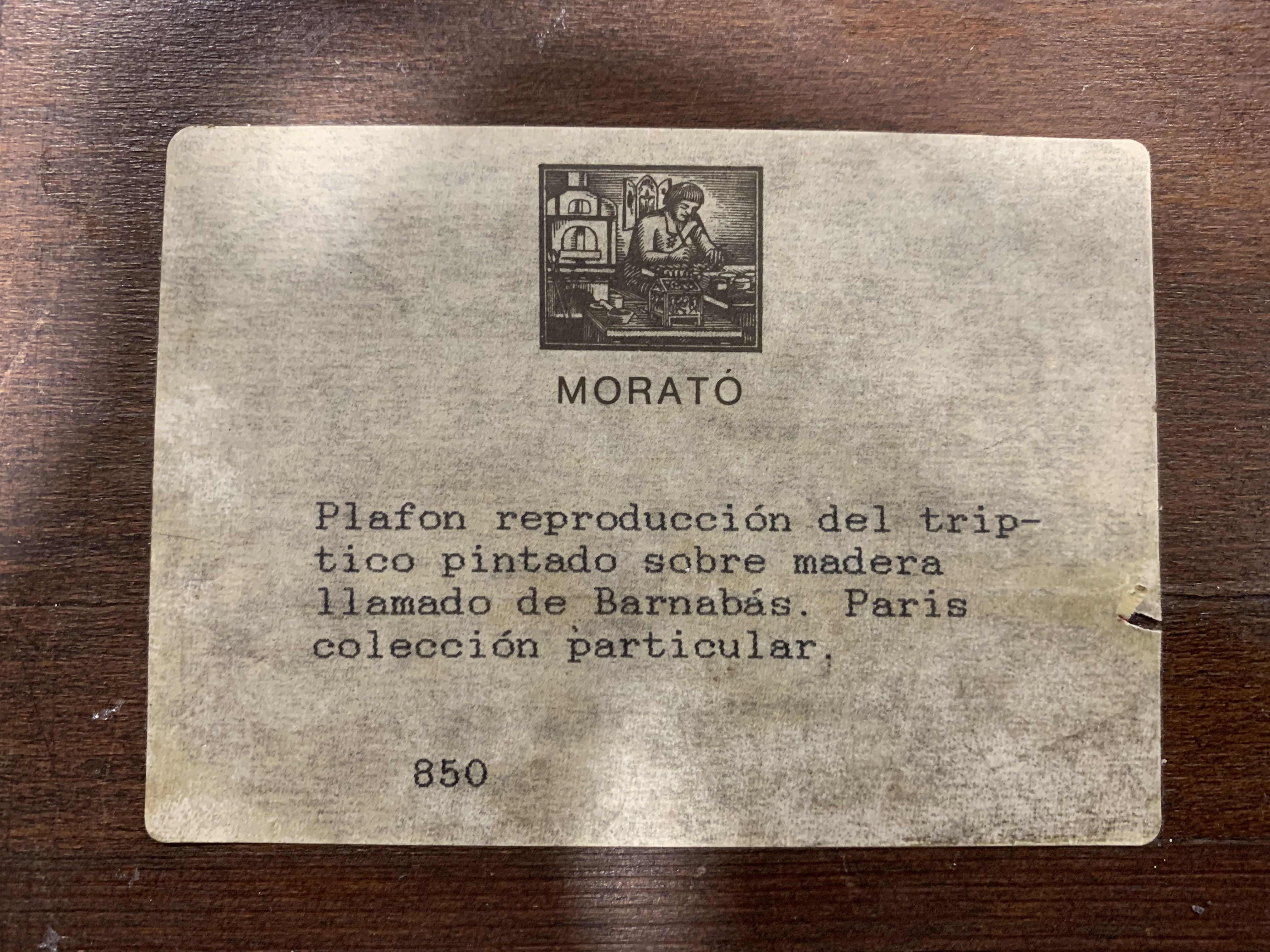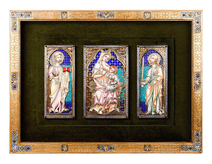 Tríptico neo-gótico de gran formato, enmarcado, con imágenes de la Virgen con el niño flanqueada de San Juan Evangelista y San Pedro, con una bella decoración de relieves esmaltados. Apliques de esmaltes y piedras de color, con fondo de tela. Artesano Morató. [Plafón reproducción del Tríptico pintado sobre madera, llamado de Barnabás. Paris. Colección particular]