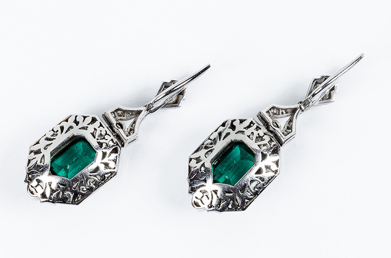Bellos pendientes largos antiguos, en montura de platino, en tres cuerpos en movimiento, con una 'esmeralda' doblete en su talla, montada en chatón y orlada de limpios y blancos diamantes, talla brillante, todo en decoración grafilada sobre copa calada (52 bts: 3.00 ct aprox., características estimadas: color H, pureza VS). Sistema de muelle. 42 mm.