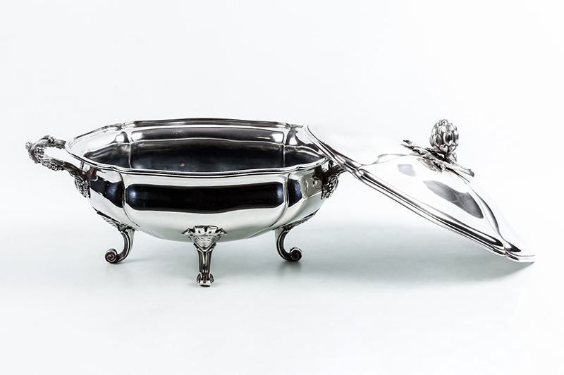 Espléndida sopera antigua (s.XIX), realizada por el maestro platero madrileño Antonio Martínez en plata maciza 916 mil, contrastada, de cuerpo oval lobulado, con cuatro patas con forma de roleos. Asas decoradas con vides y racimos de uvas, y detalle de bellotas coronando la tapa. C 1848. 40 x 22 cm. [Antonio Martínez fue un conocido orfebre, activo entre 1840 y 1890. Trabajó para la Real Fábrica de Platería, que producía piezas de lujo para la burguesía y la corte]