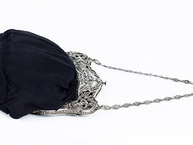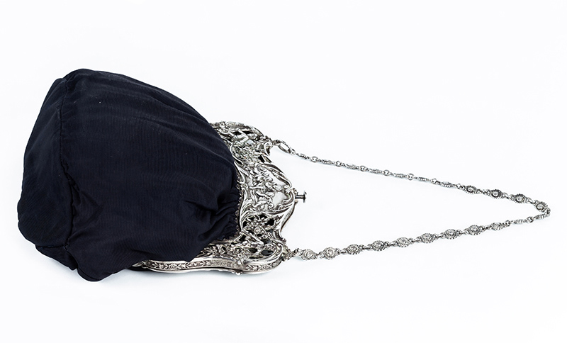 Bolso de mano vintage en plata y tela negra, con decoración calada estilo rococó, con motivos de flores y angelotes. Con cadenita. 20 x 22 cm.