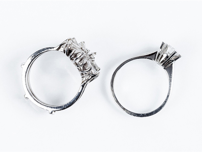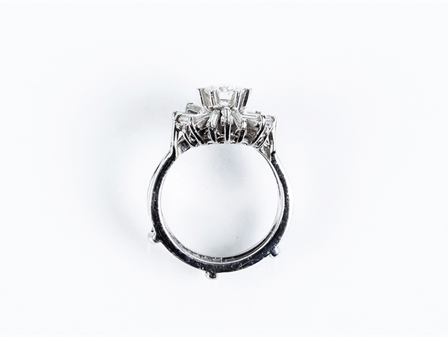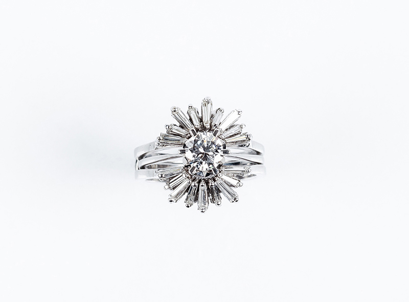 Sortija desmontable vintage, en sólida montura de oro blanco 18 K, formada por anillo solitario central con un limpio y blanco diamante, talla brillante moderna, en sólidas garras y 'sandwich' formando una orla escalonada de diamantes trapecio (1 bte: 0.75 ct aprox, características estimadas: color G, pureza VS, y 18 dts: 0,50 ct aprox., características estimadas: color G-H, pureza VVS-VS). Nº de anillero: 16-17. Con estuche de piel y terciopelo de Joyería Cárdenas de Logroño.