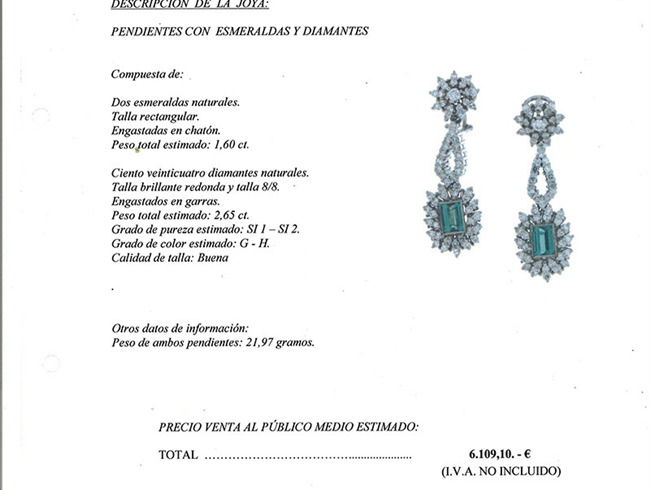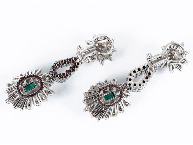 Pendientes largos vintage en oro blanco 18 K, articulados en tres cuerpos con movimiento, con bellas esmeraldas verdes, talla rectangular, con doble orla y motivos en lágrima y rosetón cuajados de limpios y blancos diamantes talla brillante (2 Esm: 1.60 ct aprox y 120 bts: 2.65 ct aprox., características estimadas: color G-H, pureza SI). Se acompaña de Informe/Tasación del Laboratorio GEMACYT de 1010. Sistema omega. 43 mm.