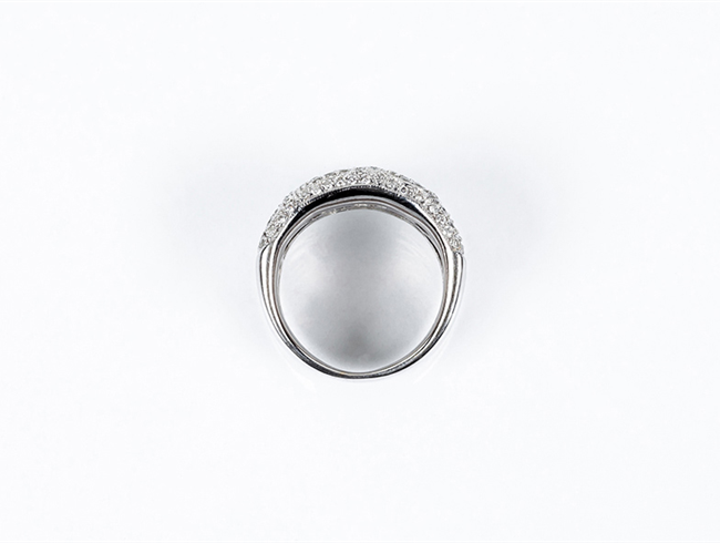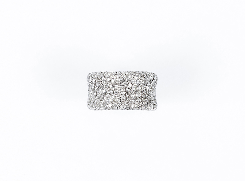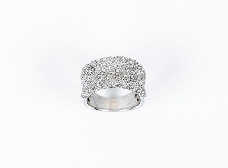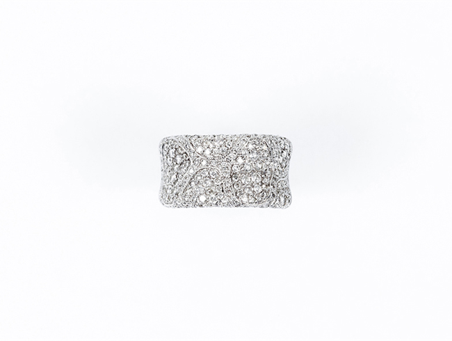 Elegante sortija en oro blanco 18 K, con frente curvado, con patrón geométrico grafilado, en pavé de limpios y blancos diamantes talla brillante (150 btes: 0.80 ct aprox., características estimadas: color H, pureza VS). Nº anillero: 10.