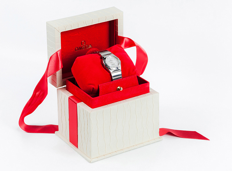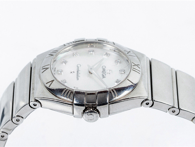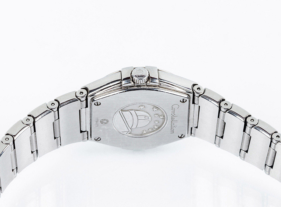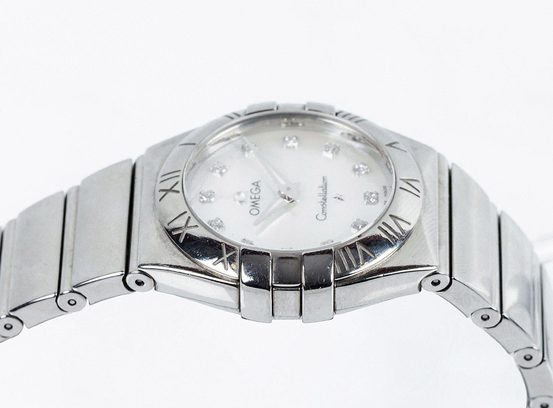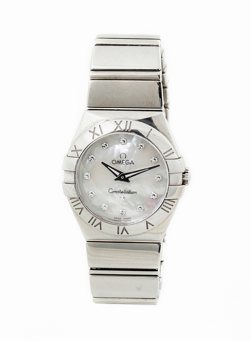 Reloj suizo sra., OMEGA Constellation "My Choice" Quartz, ref.: 123.10.27.60.55.001, en caja 28 mm, y brazalete de acero. Esfera de nácar con puntos de diamantes. Agujas dauphine plateadas luminiscentes. Movimiento de cuarzo Omega Calibre 1376, ±10 segundos/año. Muy buena condición (2). Estado de marcha. 14 cm. Se acompaña de 3 eslabones, estuche y documentación 2013.