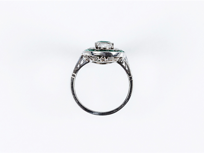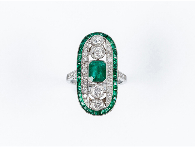 Bella sortija lanzadera estilo 'art-decó', en montura de platino, con una esmeralda central, en su talla, flanqueada de 4 limpios y blancos diamantes, talla brillante y brillante antigua, enmarcados en motivo geométrico calado con bandas de esmeralditas calibradas, y limpios y blancos diamantes talla brillante, todo en decoración grafilada. Diamantitos en los hombros (1 Esm: 1.38 ct, 40 esm: 1.48 ct aprox.; 4 bts: 0.80 ct aprox., características estimadas: color H, pureza VS, y 22 bts: 0.56 ct aprox., características estimadas: color H, pureza VS). Nº de anillero: 15.
