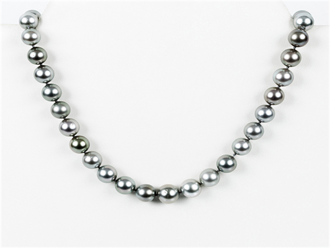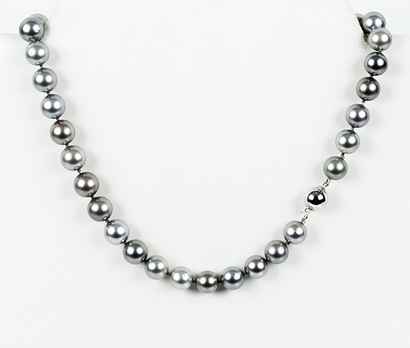 Collar de 39 bellas perlas grises de Tahití, calidad gema, en ligera disminución (12-11 mm.), cierre de bola en oro blanco 18 K. 46 cm.