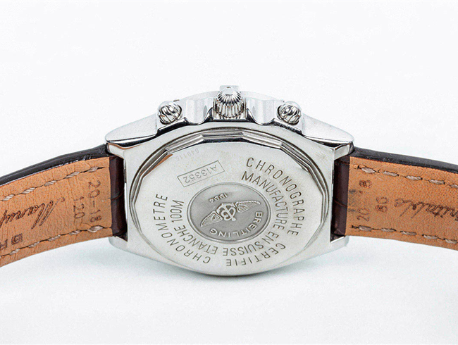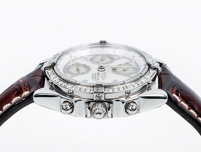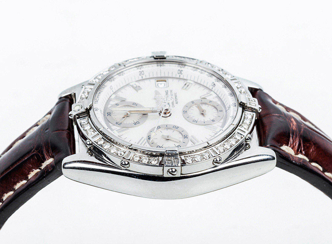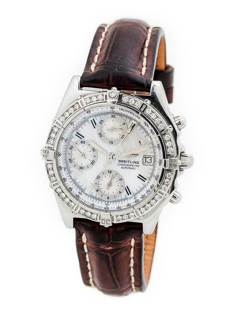 Reloj cronógrafo cab-unisex. suizo BREITLING, 'Chronomat Evolution', Cronómetro certificado, ref. A13352 en caja de acero 39 mm (nº 549115) con coronas roscadas y bisel giratotrio cuajado de limpios y blancos diamantes, talla brillante. Escala taquimétrica interior. Esfera de nácar natural con tres subdiales. Movimiento mecánico automático, calibre Breitling 13 (ETA Valjoux 7750 modificado). 25 Rubíes, 28.800 A/h, reserva de marcha ~42 horas. Certificado COSC. Calendario a las 3. Pulsera de piel de cocodrilo y hebilla originales. C. 2004. Excelente condición (0-1). Se acompaña de manual, documentación y estuche.