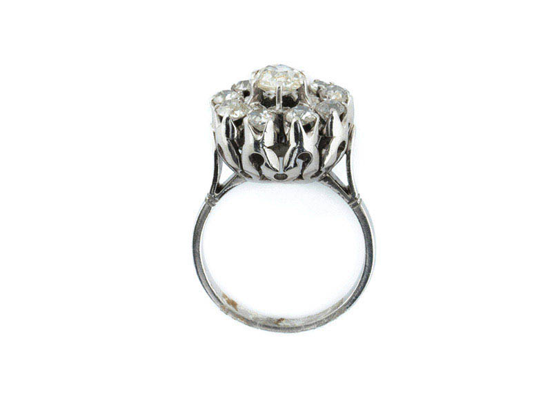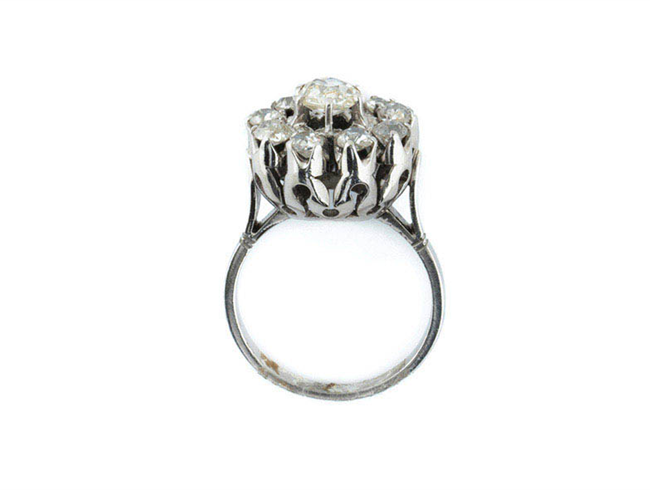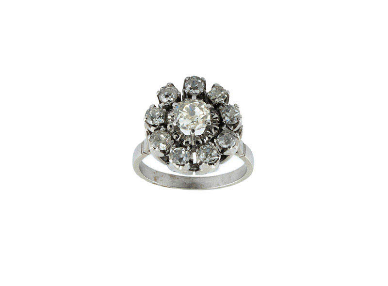 Bella sortija vintage en sólida montura de oro blanco 18 K con rosetón de limpios y blancos diamantes, talla brillante antigua y cushion, en garritas sobre copa calada (1 bte: 0.45 ct aprox., características estimadas: color I, pureza VS y 9 bts: 0.80 ct aprox. Características estimadas: color G-H, pureza VS-SI). Nº de anillero: 12.