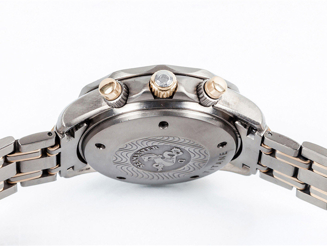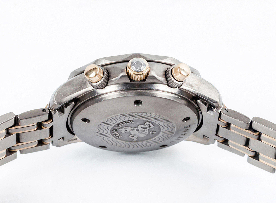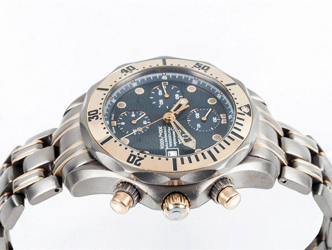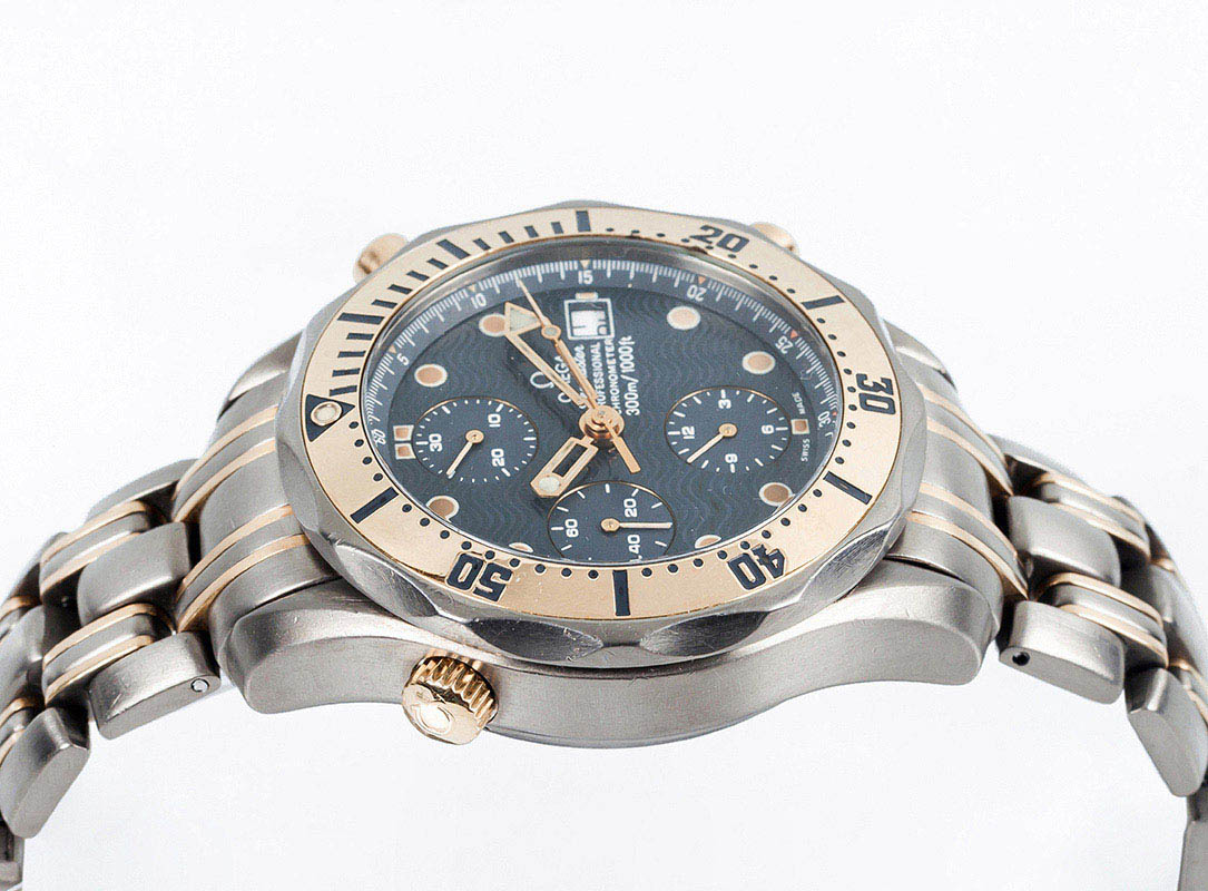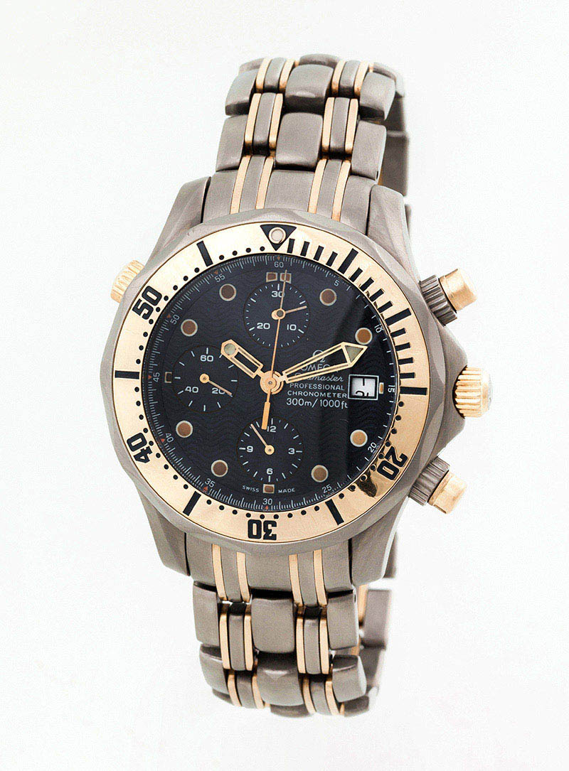 Reloj cab., suizo OMEGA 'Seamaster Profesional Chronometer Chronograph 300 m'. Ref. 2296.80.00, en caja 42 mm, con cristal zafiro y bisel giratorio unidireccional en oro amarillo 18 K, válvula de helio a las 10, pulsadores y corona roscada, y brazalete de titanio (acabado brushed), con cierre desplegable, originales, con detalles de oro amarillo 18 K. Movimiento Automático Calibre 1164 (basado en Lemania 1873 modificado por Omega; 31 rubíes, 28.800 vph, reserva de marcha 48 h; cronómetro certificado COSC de época; antimagnético. Esfera cerámica grafito ondulante con puntos de tritio y agujas esqueleto luminiscentes, doradas. Segundero central. Tres subesferas tricompax. Calendario a las tres. C. 1987. Excelente condición (1). Estado de marcha. 19,8 cm. [Esta referencia es un prototipo raro de la SMP (Seamaster Professional), desarrollada en 1986-1987 como sucesora del Seamaster 120 m, y anterior al boom de la publicidad en la película de James Bond en 1995. Aunque no hay un número
