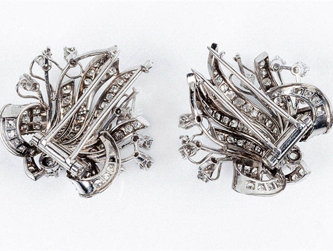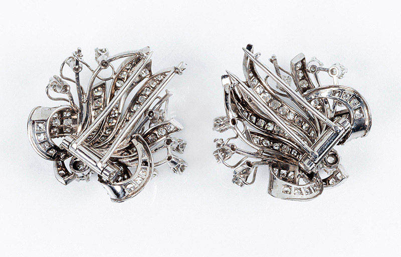 Conjunto vintage de dos clips de solapa en platino, con motivo vegetal y lazada, cuajados de limpios y blancos diamantes talla brillante en garritas, y diamantes 8/8, en melena de bandas curvadas (2 bts talla ant: 0.60 ct, 14 bts:0.75 ct y 140 dts: 3.20 ct aprox. Características estimadas: color H, pureza VS). 35 x 33 mm.