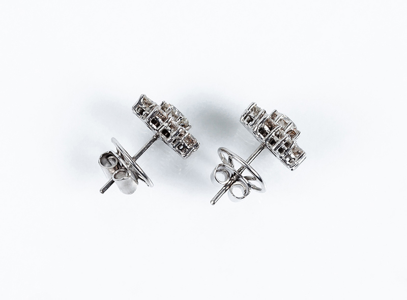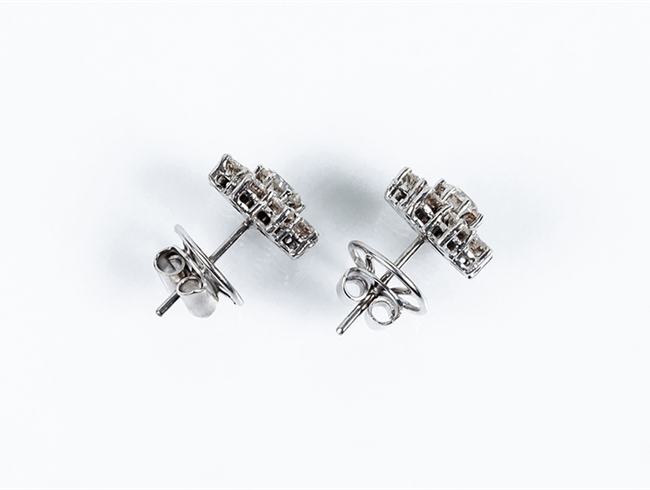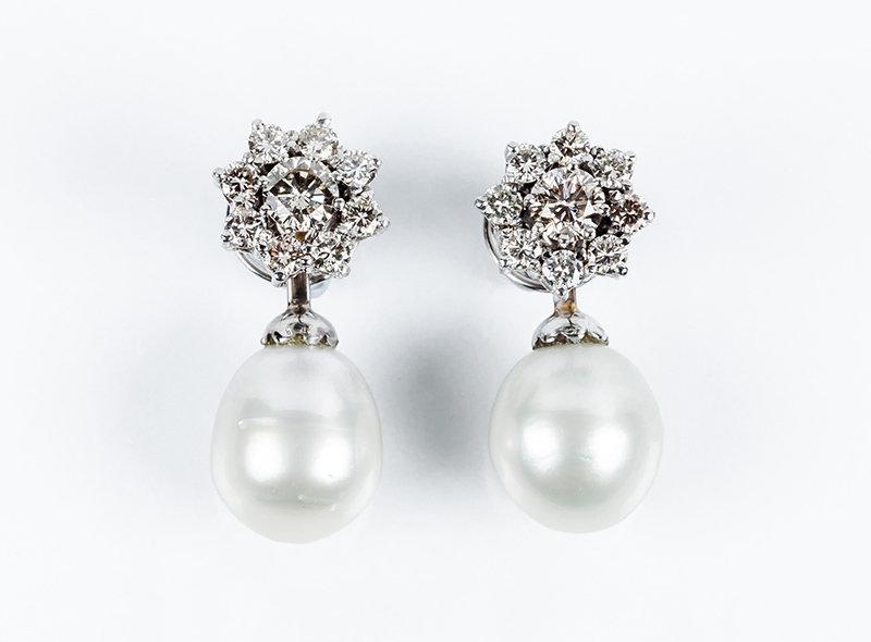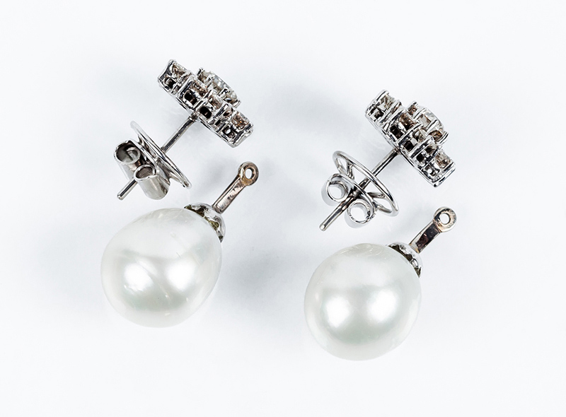 Pendientes en oro blanco 18 K, con un rosetón de limpios diamantes, talla brillante, en garras y una bella perla australiana en perilla (16.4-17.3 x 13.3 mm), desmontable (2 bts: 1.00 y 16 bts: 1.60 ct aprox. Características estimadas: color M, pureza VS). Sistema de presión con volante. 30 mm.