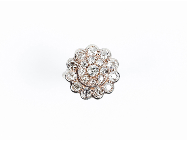 Espléndida sortija vintage en sólida montura de oro blanco 18 K, con motivo rosetón formado por centro y doble orla de limpios y blancos diamantes, talla brillante antigua y 'cojín' (1 bte: 0.25 ct y 19 bts: 2.80 ct aprox., características estimadas: color H-J, pureza VS-SI). Nº de anillero: 14-15.