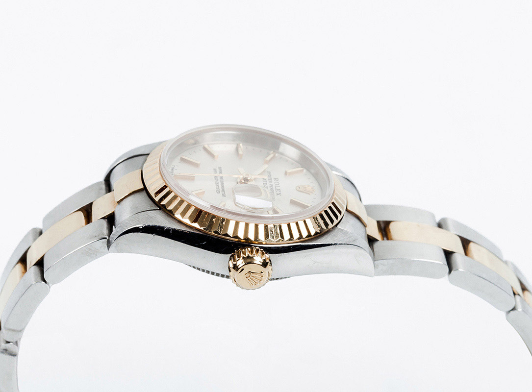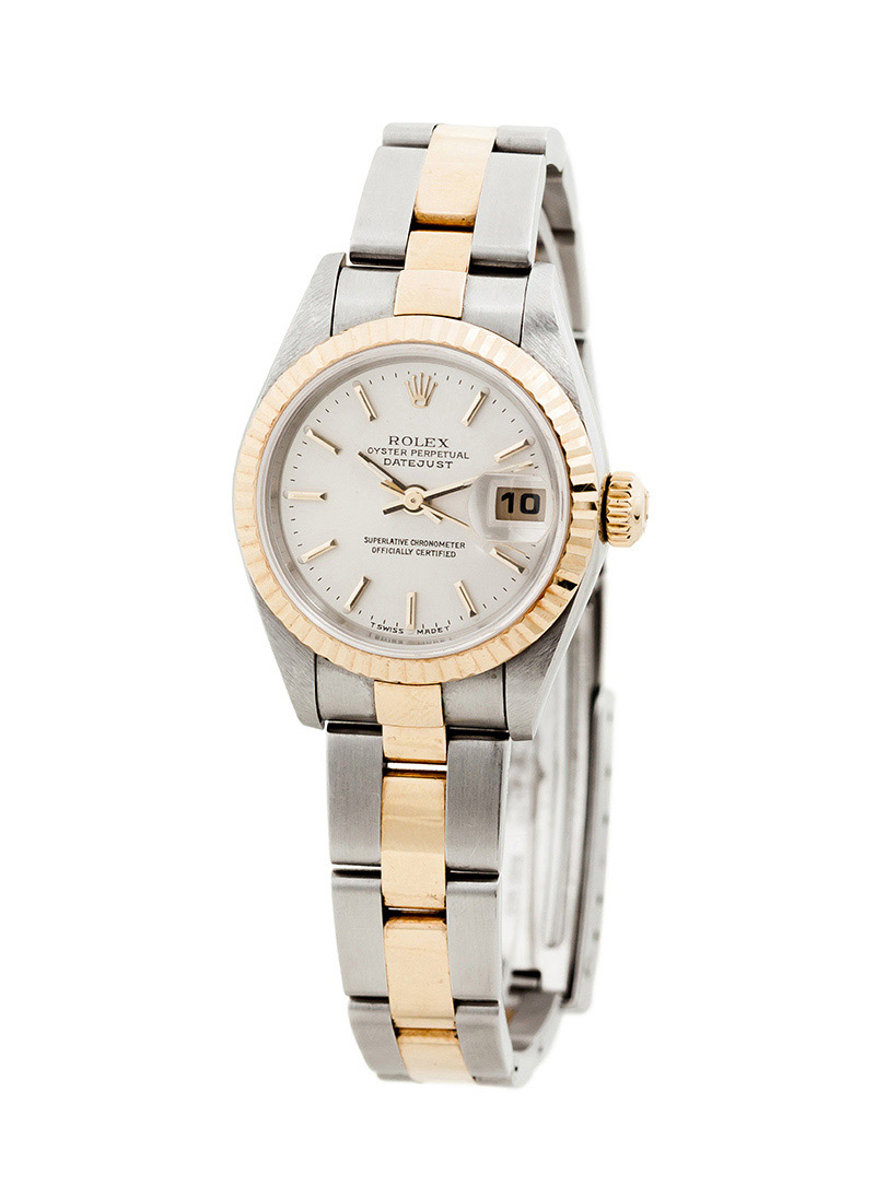 Reloj suizo sra. ROLEX, mod. Lady Oyster Perpetual Date Just, ref 79173 -cronómetro certificado. Caja 26 mm y brazalete en acero-oro. Movimiento automático. Esfera plateada con baquetones y agujas doradas. Segundero central. Calendario. Cristal zafiro. C. 2004. Excelente condición (1). Estado de marcha. Con su documentación, estuche, manual, etiqueta y sobre-caja.