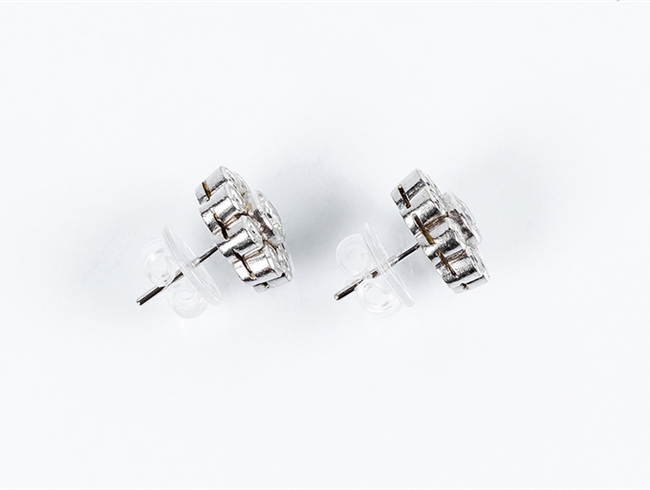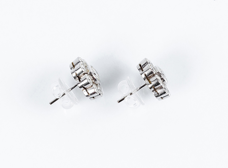 Pendientes vintage, en sólida montura de platino u oro blanco 18 K, con rosetón formado por un limpio y blanco diamante central, talla brillante, orlado de brillantes de menor tamaño, en chatón (2 bts: 0.80 ct aprox., y 16 bts: 1.40 ct aprox. Características estimadas: color G, pureza VS-VVS). Presiones de silicona. Diámetro: 14 mm.