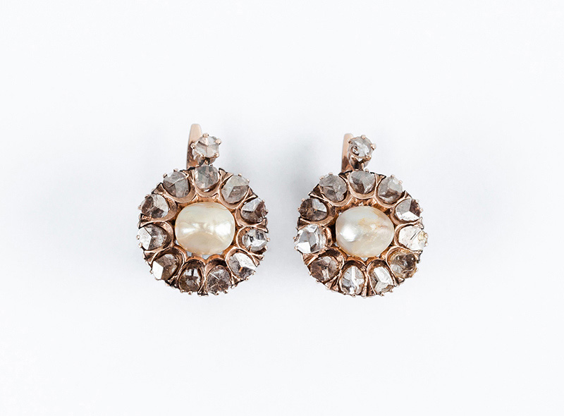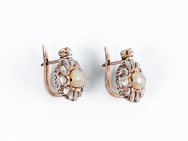 Pendientes antiguos en oro rosa 18 K, formando un rosetón con perla central y orla de diamantes, talla simple y talla rosa (24 dts: 2.20 ct aprox). Sistema catalán. S. XIX. 20 x 15 mm.