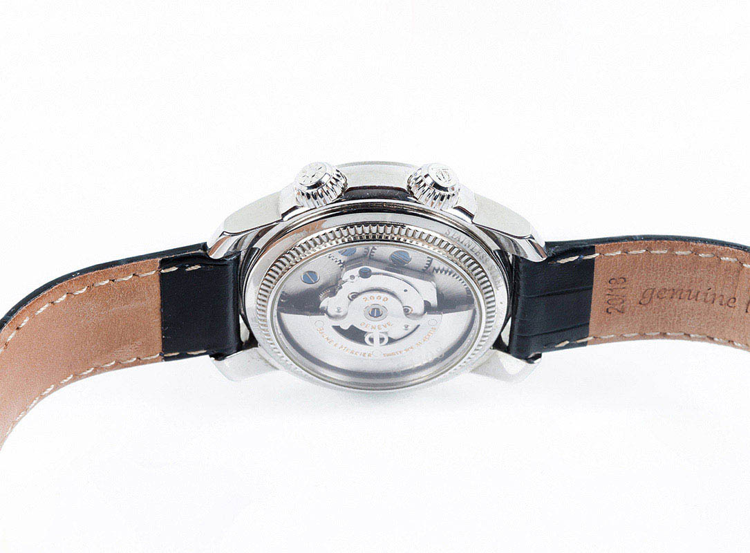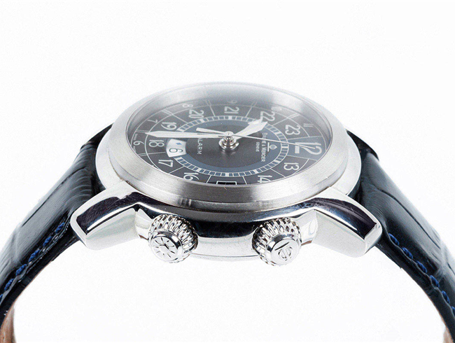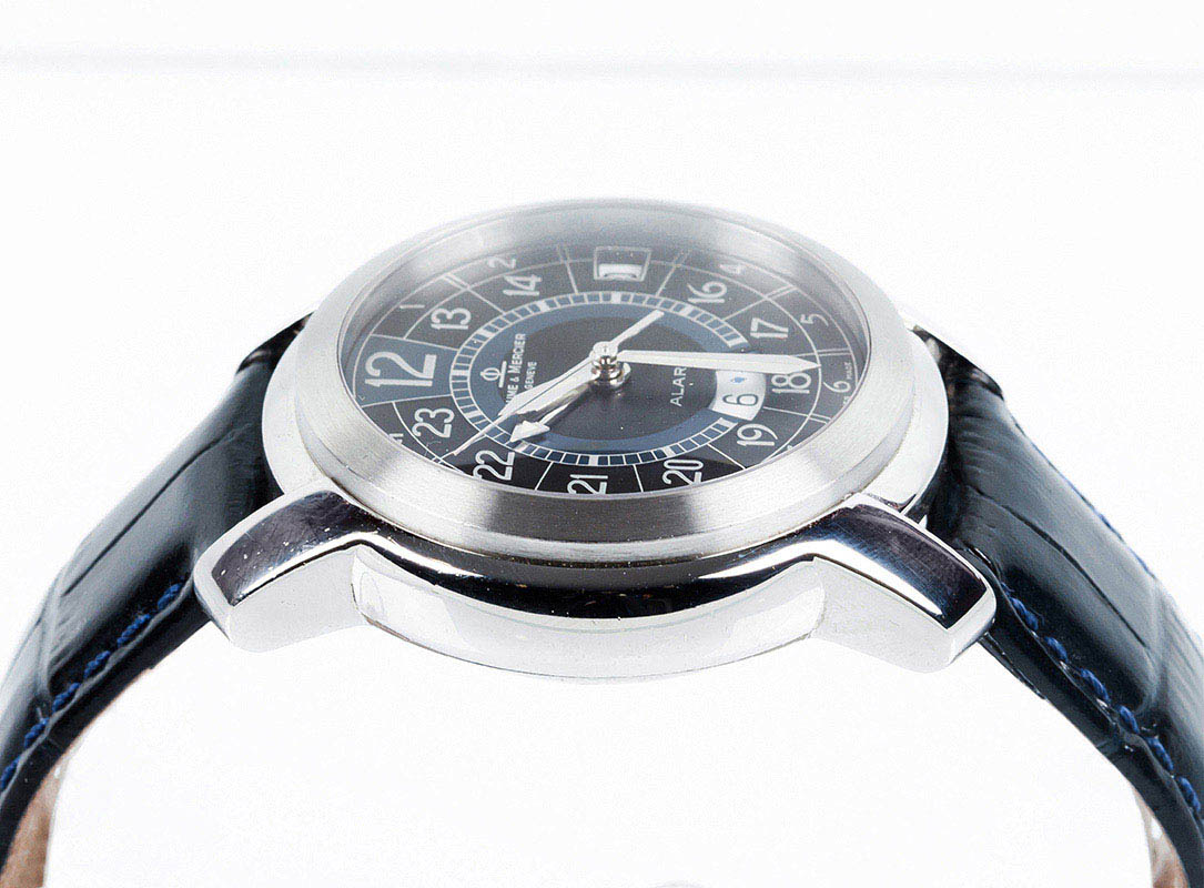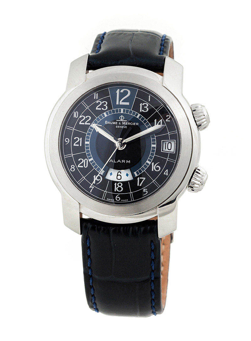 Reloj suizo caballero BAUME&MERCIER, 'Capeland Alarm', ref. 65322, en sólida caja circular de acero brillo y matizado, 37 mm con cristal zafiro curvado antirreflectante y fondo de cristal zafiro. Movimiento automático ETA 2892-A2 con alarma Dubois-Dépraz 2025, 31 rubíes, 28.800 vph. Reserva de marcha: ~42 horas + ~45 min (alarma). Esfera bi-tono negra matizada y azul con numerales arábigos y agujas plateadas y luminiscentes. Calendario a las tres. Brazalete de piel (a estrenar-no original). Excelente condición (0-1). Estado de marcha. Se acompaña de documento de compra (2002), funda, estuche de madera y sobre-caja originales.