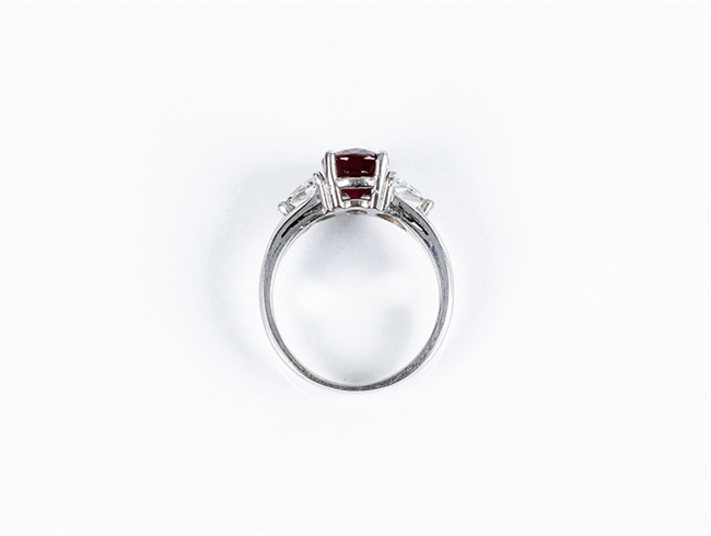 Sortija en oro blanco 18 K con un bellísimo rubí 'sangre de pichón' (probablemente de origen Birmania), talla oval, flanqueado por dos limpios y blancos diamantes, talla triangular, en garritas (1 Rub: 1.90 ct aprox y 2 dts: 0.45 ct aprox, características estimadas: color G, pureza VS-SI). Nº de anillero: 11.
