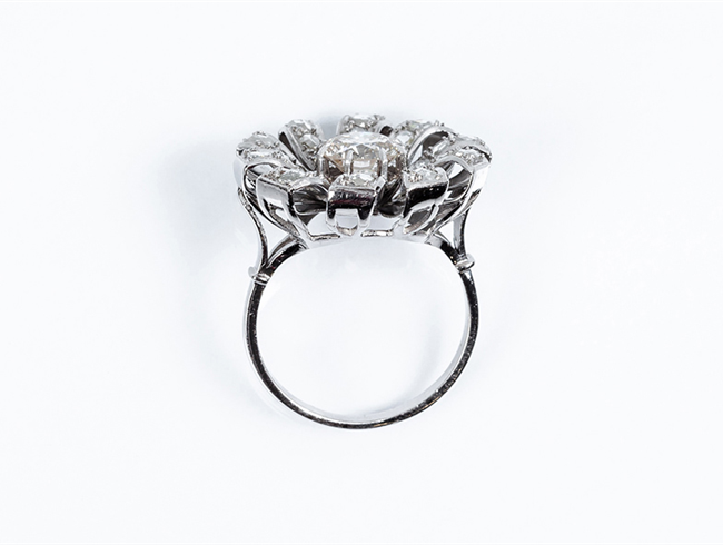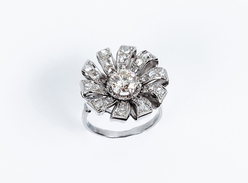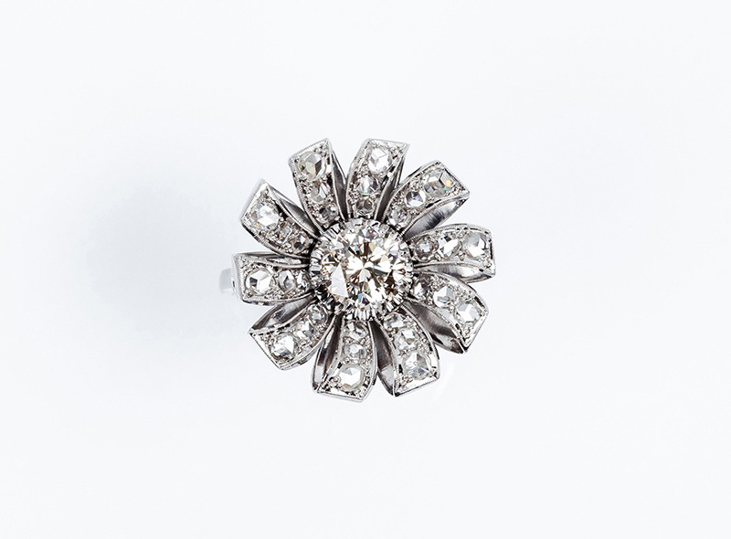 Bella sortija vintage en forma de flor, en platino, con un limpio y blanco diamante natural central, talla brillante, orlado en 'pétalos' cuajados de diamantitos talla rosa en decoración grafilada (1 bte: 1.30 ct aprox., características estimadas: color K, pureza VVS, muy buena talla, pulido y simetría, fluorescencia fuerte; 30 dts: 1.20 ct aprox. Características estimadas: color G-H, pureza VS). Nº de anillero: 18.